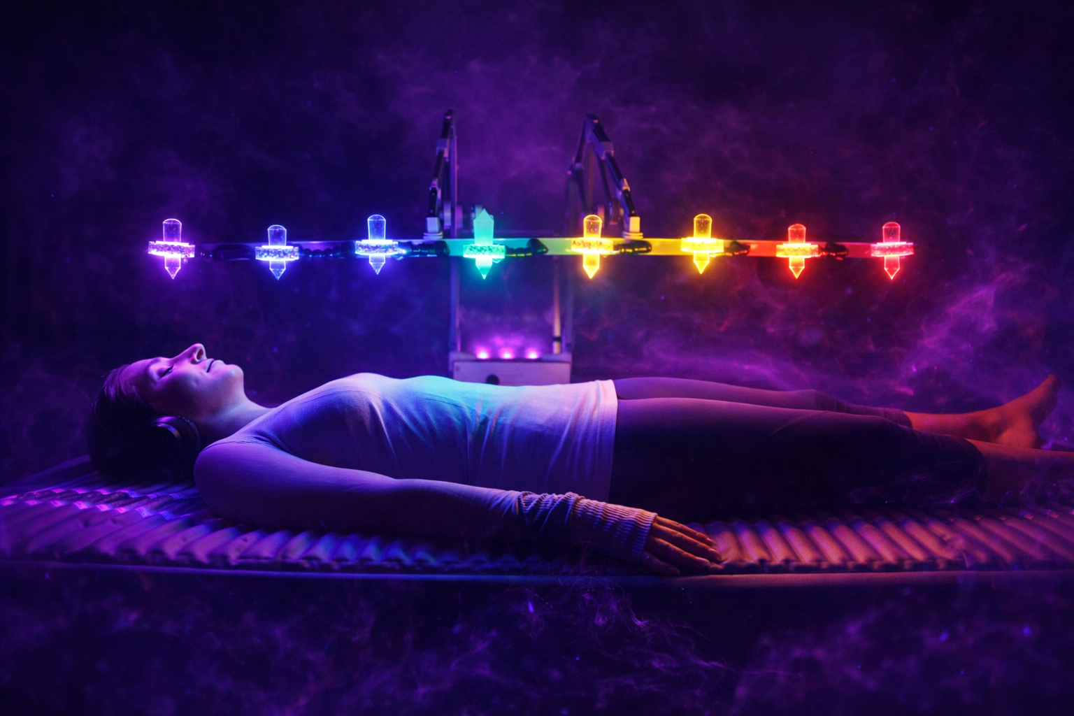 Light bed therapy uses colored lights and crystals to balance the body’s energy, promote relaxation, and support emotional and physical healing.